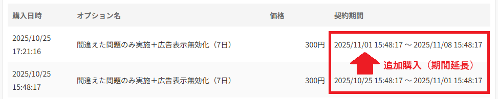※ちなみに新規に購入、または契約期間外の購入の場合は「購入日から購入日に購入日数を足した日まで」が契約期間、契約期間内での追加購入の場合は契約期間延長となるため、「契約期限日から契約期限日に購入日数を足した日まで」が契約期間となります。